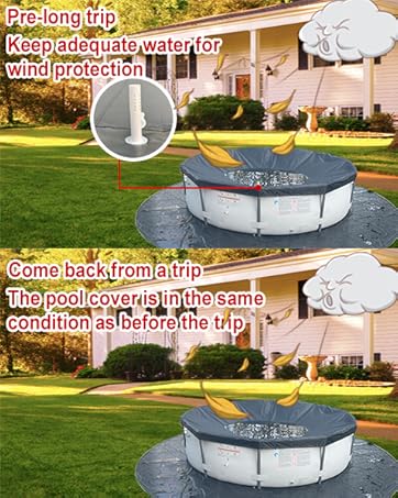 1:Water level in the pool is 15inch from the pool edge. Pool cover can withstand one ton of water. In extreme weather. Please keep a certain amount of water in the pool