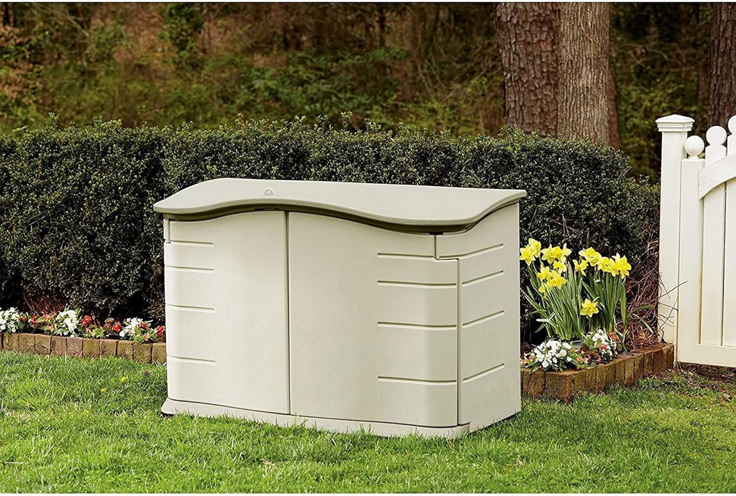 The Rubbermaid Small Horizontal Storage Shed won't be visible over common backyard fences and stores a vareity of items including small garden tools and supplies, firewood and more. Shed possesses various access points to enable quick and easy interior access through side doors and lid. The shed roof and siding are constructed of a durable resin for extra strength and security.